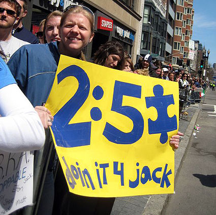 and then there's sam. sam also had a killer training for boston coming off of 61 marathons a 2 ultras in 2010. again, ill let you read his 2011 boston recap here. i first met sam at boston in 2010. it was at the post race lunch in 2010 that i got the ass kicking i needed to a) run a marathon and b) make a difference while doing it. i followed sam and his crazy race schedule for the rest of 2010 and was eager to see him back in boston in 2011. boston is a course that sam runs well on and he has been chasing a sub 3 marathon since his 8th marathon. boston was his 92nd. sam is one of the most humble men i know. he doesn't gloat about his speed. he doesn't brag about 2010. he just goes out there and does it. however, ask him about train 4 autism or why he is running the san francisco marathon and he will tell you everything you need to know! it would have been easy for him to put a sign on his back last year and said "this is my X marathon this year" but that's not what he, and 2010 was about. if i were running a crazy number of marathons a year id be sure to tell everyone i came in contact with about it:-) not sam. i started off as a supporter of operation jack, i look up to sam and admire his work ethic and attitude. a roll model for all runners out there. an inspiration to me. i may have met sam because of operation jack, but im pleased and honored to call him a friend today. he is the reason i am running the mdi marathon in october for train 4 autism. 2010 wasn't about 61 marathons, it was about bringing awareness to train 4 autism and thats what he did. without sam, the maine chapter of train 4 autism wouldn't exist. he has even agreed to slog it out with me and pace me at mdi. he says if i can go 4:06:23 i can forever hold it over his head that i ran my first marathon faster then him (4:06:24). now thats a good friend, a sub 3 runner agreeing to run a 4+ hour marathon. i hope he knows what he's in for.